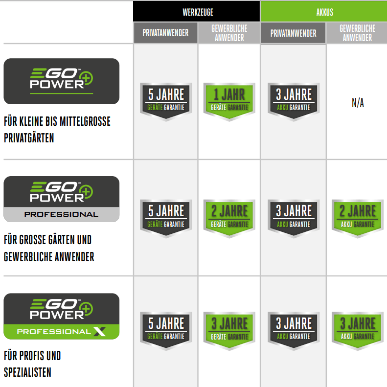 Wir bei EGO sind stolz darauf, Produkte herzustellen, die nicht nur eine mit benzinbetriebenen Geräten vergleichbare Leistung bieten, sondern auch zuverlässig und robust sind. Deshalb sind alle unsere Produkte durch umfassende Garantien * abgedeckt, auf die Sie sich verlassen können.